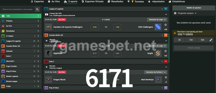 O 6171 oferece uma grande seleção de opções de apostas em e-sports com probabilidades competitivas